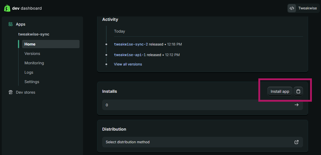 On the Home section, click Install app, select your shop to install the authentication app in your Shopify environment.