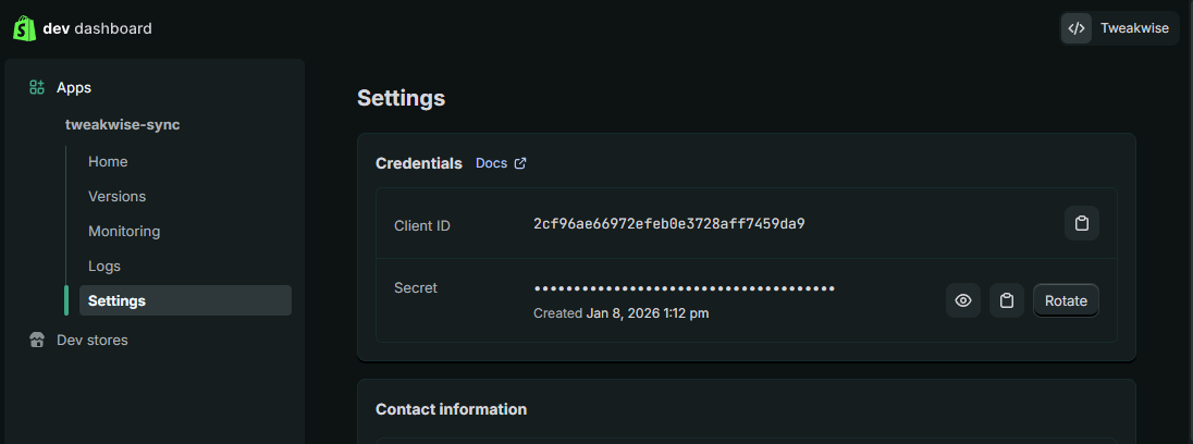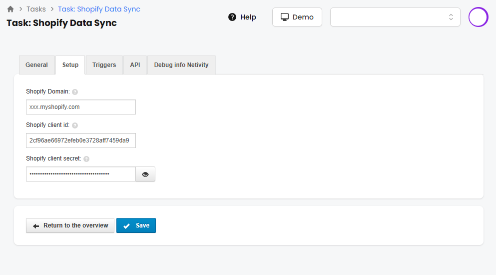 In Tweakwise, go to the Shopify Data Sync job. Enter the Client ID, Secret and your Shopify store name (xxx.myshopify.com) in the setup tab: