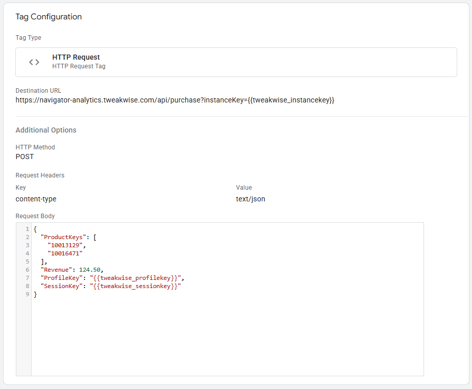 ProductKeys | List of Text | Array of unique id's of the items (known at Tweakwise) in the transaction |